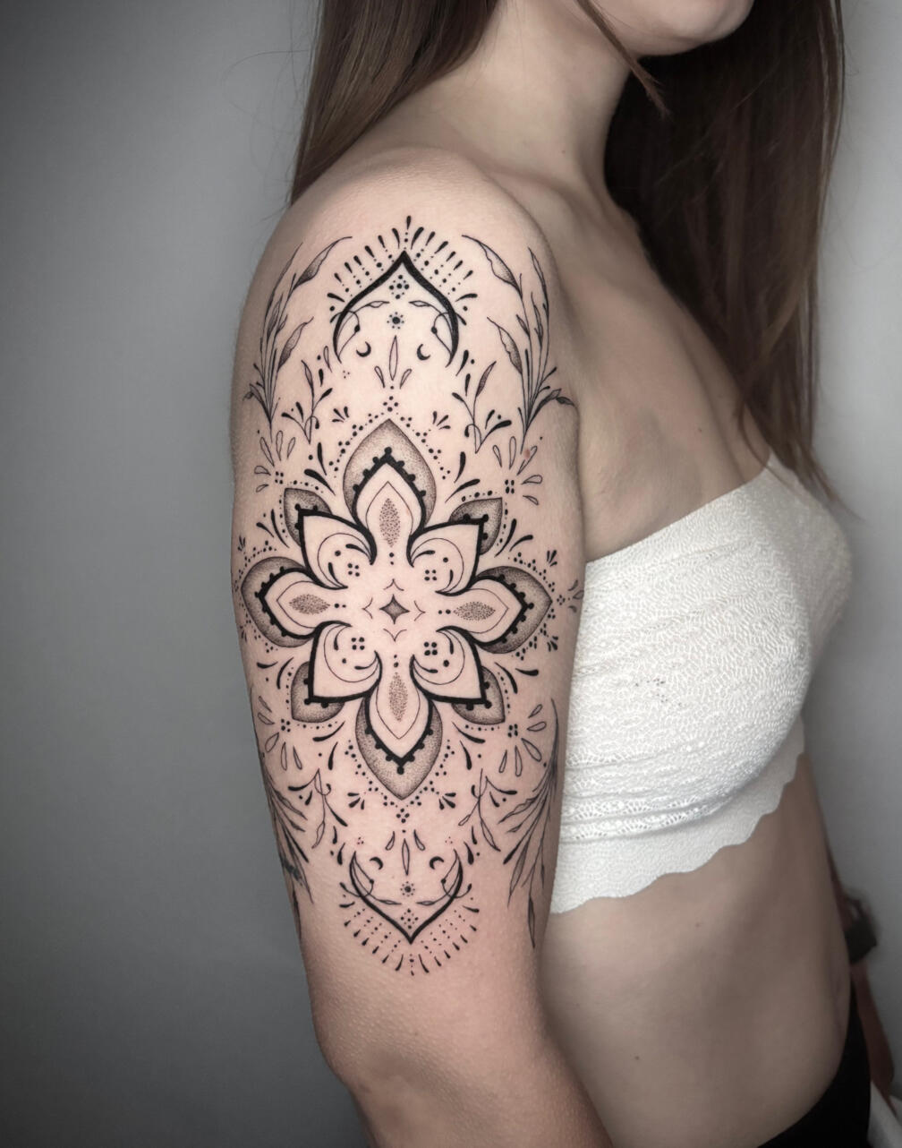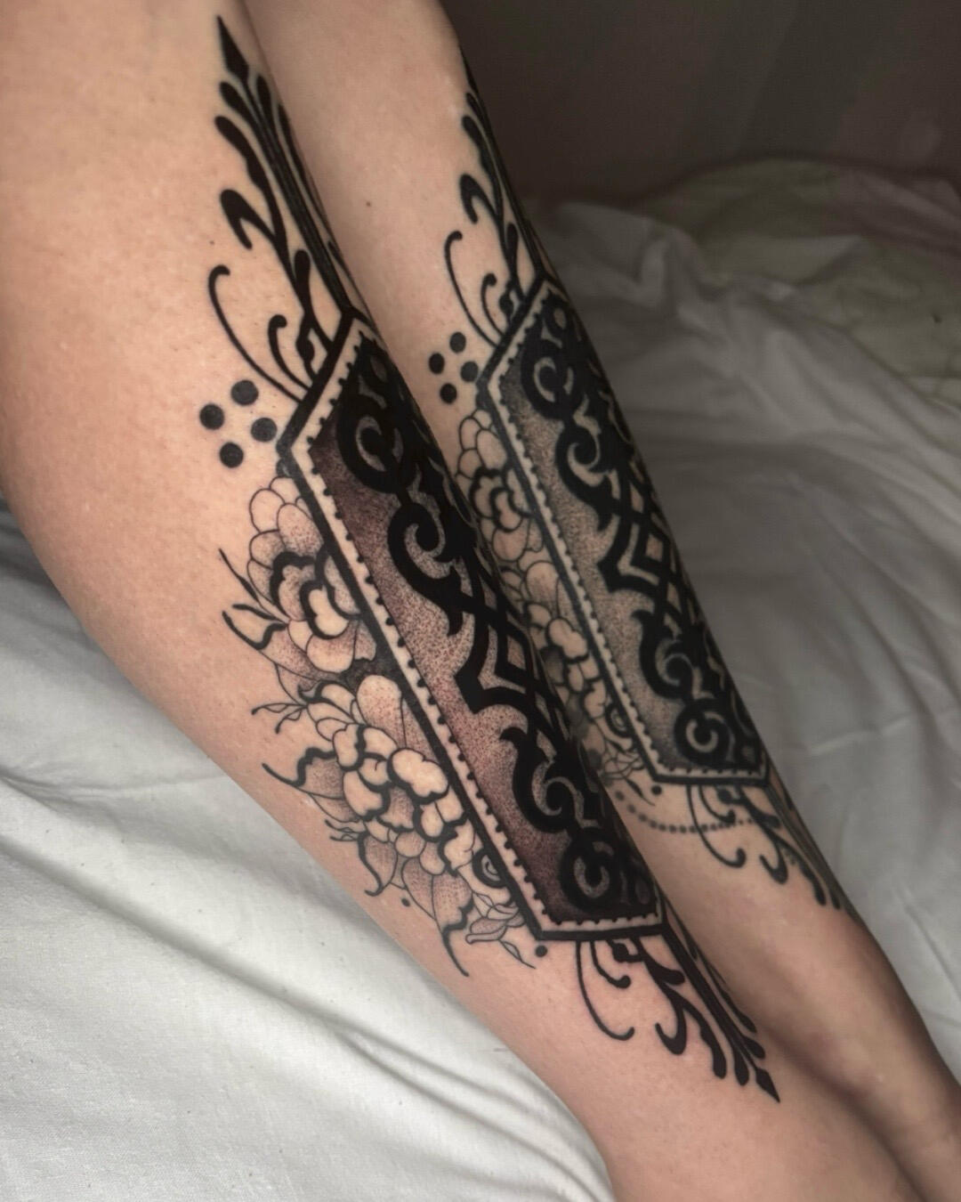 Nel tatuaggio ornamentale applico un metodo di progettazione che combina simmetria, armonia e adattamento anatomico.Realizzo ornamentali floreali, mandala, pattern geometrici e composizioni personalizzate, studiando ogni elemento in funzione della zona del corpo da tatuare.Il mio lavoro si concentra sulla definizione dei volumi, sulla coerenza degli spessori e sulla leggibilità del disegno nel tempo. Ogni progetto viene costruito su misura, con particolare attenzione alla precisione del tratto e alla resa estetica finale.